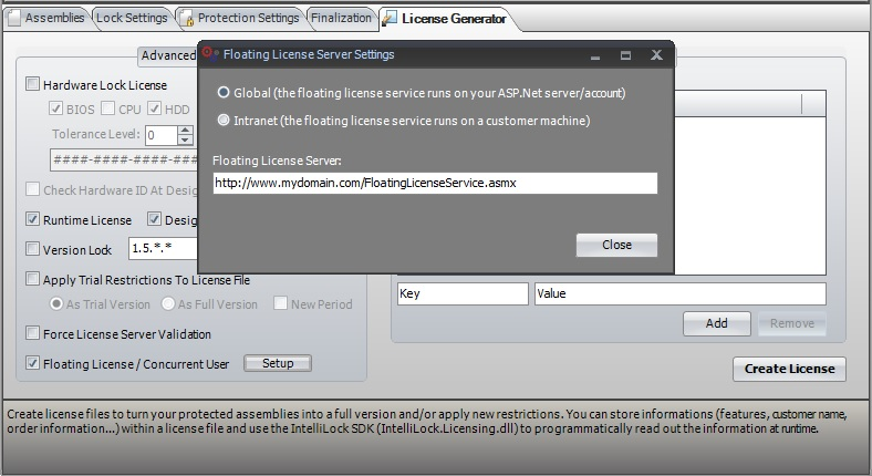 Open the IntelliLock project file for your application. At least one trial restriction must be enabled (tab "Lock Settings"). In tab "License Generator" check "Floating License / Concurrent User" and click the "Setup" button. Check "Global" and enter the address to FloatingLicenseService.asmx.